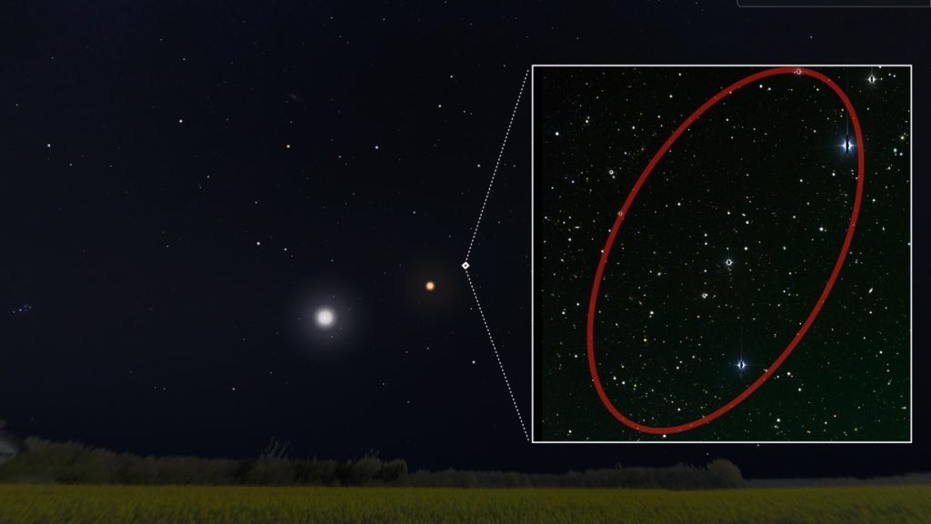 Image title: Arrival direction of a high-energy neutrino multiplet event determined by the IceCube experiment, overlaid on the visible night sky (generated with Stellarium).