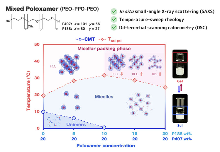 Poloxamers are polymeric materials that are among the most trusted tools for achieving in situ gelling and are widely used in topical creams, eye drops, and even oncological drug applications. Despite their popularity, working with these materials can be challenging; even the most researched variety, poloxamer 407 (P407), is notoriously finicky. The exact temperature at which P407 turns from liquid to solid gel, called the sol–gel transition temperature, fluctuates depending on its concentration. This makes P407 difficult to ensure a formula that stays liquid in a cool syringe or vessel but solidifies reliably once it touches warm human body. Although P407 can be mixed with poloxamer 188 (P188) to finely tune its transition temperature, the underlying physics governing this behavior remain unclear.