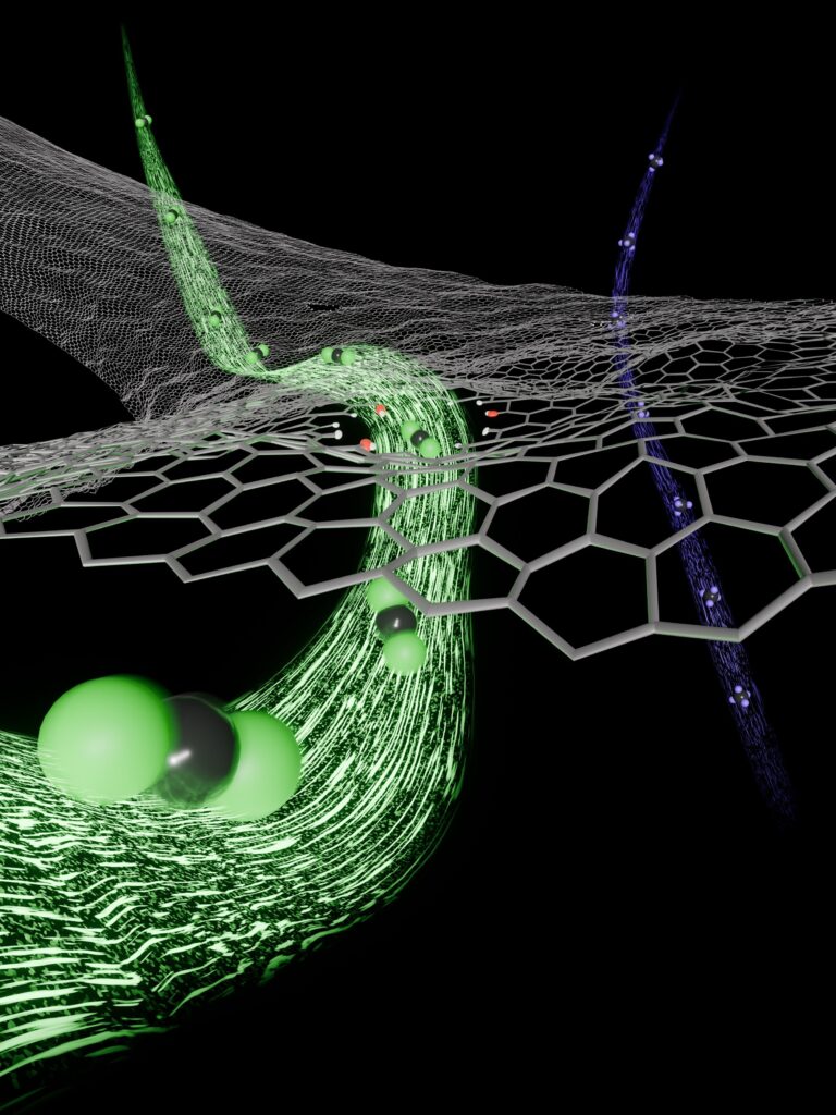 Image caption: Introducing oxygen groups at graphene pore edges strengthens carbon dioxide (CO2) selectivity over methane (CH4), allowing rapid gas flow while efficiently removing impurities from gas mixtures.