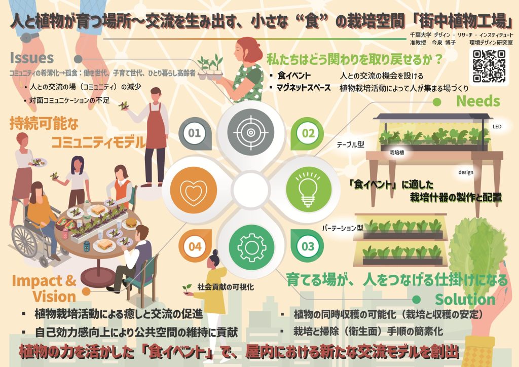 人と植物が育つ場所~交流を生み出す、小さな“食”の栽培空間「街中植物工場」 2025.10.17 千葉大学 デザイン・リサーチ・インスティテュート 今泉 博子 准教授 高齢者施設での園芸活動支援、植物工場を用いた地域拠点・執務空間におけるコミュニティ形成支援、診療空間におけるコミュニケーション支援等。 作業とコミュニケーションを最適なバランスにするための、ハード面・ソフト面を支援するデザインについて、可能な限り現場に入り込んで研究する。 最近関心を持っているテーマ: 東洋医学×環境デザイン 研究 / 人生におけるモットー: あゆみより 趣味 / 休日の過ごし方など: 子育て(6歳・1歳) 他おすすめの研究インフォグラフィック 新しい栄養価や味を持つ低糖質・高脂質野菜の開発 2024.02.08 屍化学(ネクロケミストリー)の創成と社会実装生命の死を起点とした化学への挑戦 2025.03.31 医療を支える臨床情報の共有患者の安全を確保する標準規格と連携機構 2025.09.10