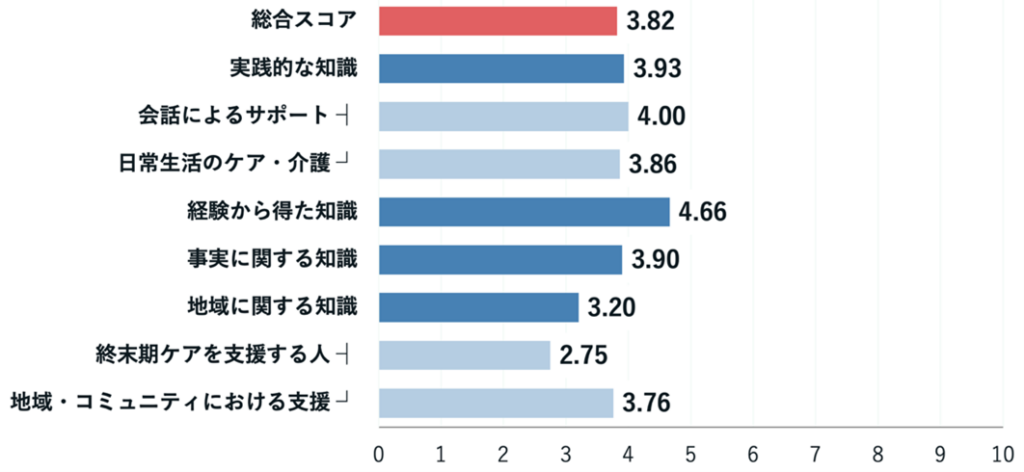 強み:「経験から得た知識」のスコアは4.66点(10点満点)と比較的高い傾向にあり、身近な人の死などを通じて個人的な学びを得ていることが示唆されました。
