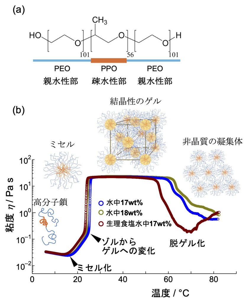 図1:(a) 重要なドラックナノキャリアであるポロキサマー407の化学構造。三つの部分から構成され、両端に生体親和性にも優れた親水性部分、中央に疎水性部分を持つ。(b) 温度の上昇にともなうミセル化、ゲル化、および、ゲルの構造が崩壊する脱ゲル化の挙動。親水性・疎水性部分の色分けは(a)の図と対応。