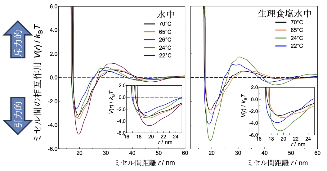 横軸はミセル間の距離を示し、縦軸はマイナス方向が引力的な相互作用が強いことを、プラス方向は斥力的な相互作用であることを示す。 (左図) 水中での高分子ミセル間の相互作用場で、22℃、24℃、26℃がゲル化温度より低温でのゲル化段階であり、65℃と70℃はゲルが崩壊し非晶質の集合体に相当する状態。 (右図) リン酸緩衝生理食塩水PBS(−)中での高分子ミセル間の相互作用で、22℃と24℃がゲル化温度より低温でのゲル化段階であり、65℃と70℃はゲルが崩壊し非晶質の集合体に相当する状態。各相転移温度は、粘度測定(図1b)により決定。水中より生理食塩水中で、縦軸がマイナスにより大きな値を示しており、引力的相互作用が水中より生理食塩水中で強くなっていることを示している。