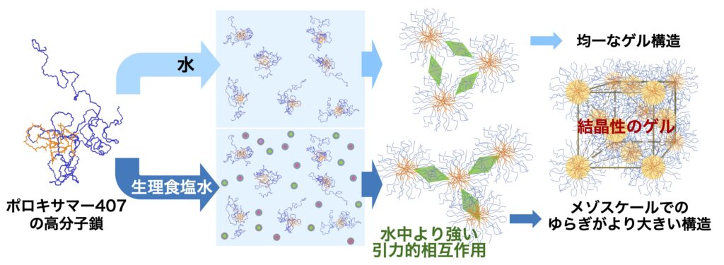 また、高分子ミセル、例えばP407は、結晶相であるゲルを形成する過程において、Alder(アルダー)転移とよばれる乱雑さの相違のみに起因し、非晶質(ゾル)から結晶相(ゲル)への変化を示しますが、関連した基本原理として、この結晶化過程では系を構成する粒子がより整然と整列しつつも粒子周囲の空間が増すことが知られています。本研究において、高分子ミセルのゲル化の過程で、ミセル間が互いに距離を離す挙動が突き止められました。例えば、図2の右図で、生理食塩水中での22℃(青線)から24℃(緑線)の変化において、安定化する位置や緑矢印部分の極小点位置が24℃で遠方にあります。この挙動から理解できることとして、生理食塩水中での脱ゲル化温度の低下があります(図1b)。より強い引力相互作用をミセル間が持つ場合は、ゲル化過程において、結晶化が均一でなくなり密集した凝集状態を残存させ、メゾスケールで観察される構造のゆらぎが生じます。この構造のゆらぎが、ゲルの崩壊を進行させることで、水中より生理食塩水中で、脱ゲル化が低温で生じるとするメカニズムが提案されました(図3)。
