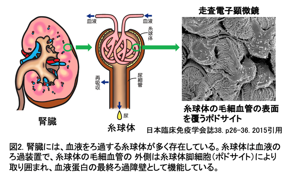 注3 )糸球体足細胞(ポドサイト):糸球体にて血液の成分をろ過して尿を作る時、血液中の蛋白が漏れ出さないように、毛細血管の表面を覆っている細胞。ポドサイトの数が減少すると血液中の蛋白が漏れだして蛋白尿が出るようになり、それが持続すると糸球体そのものが壊れて、血液のろ過が十分に行えなくなる。