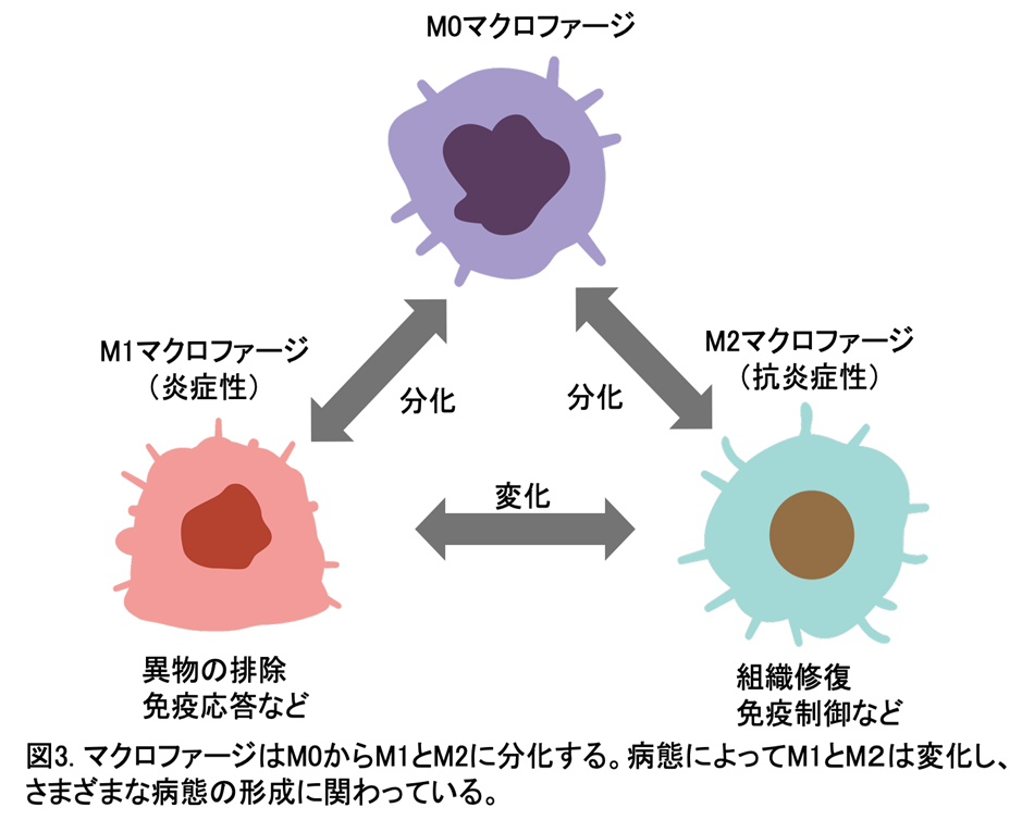 注4 )マクロファージ:免疫細胞の一つで、全身の組織に広く分布し、体内に侵入した異物を食べて消滅させたり、他の免疫細胞へ知らせたりする役割がある。マクロファージ(M0)は活性化されると、炎症を引き起こす炎症性マクロファージ(M1)と組織修復に働く抗炎症性マクロファージ(M2)に分化し、そのバランスがさまざまな病態形成に関わっている(図3)。