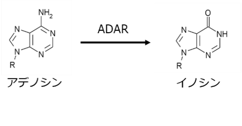 注3)A-to-I編集:RNA中のアデノシン(A)がイノシン(I)に変換される化学修飾。生体内の酵素ADARが担い、イノシンは細胞内で多くの場合グアノシンとして読み取られる。