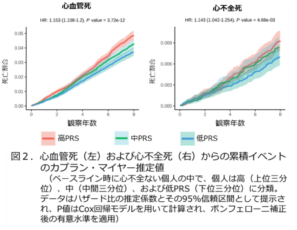 - さらに研究グループは、心不全発症や死亡リスクを予測する「多遺伝子リスクスコア(PRS)注4)」を独自に開発しました。日本人集団に最適化されたこのスコアは高い精度を示し、高リスク者の早期発見や死亡リスクの層別化が可能となりました(図2)。PRSが高い人は、若くして心不全を発症するリスクが高く、さらに診断時にはまだ心不全でない人でも、将来的な死亡リスクが高いことが分かりました。