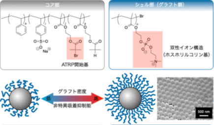 研究チームはこれまで、高分子微粒子合成法に原子移動ラジカル重合(Atom Transfer Radical Polymerization:ATRP)注3)という高分子合成の手法を組み合わせることにより、親水性の高分子鎖が導入されたラテックス粒子表面へのタンパク質の非特異吸着が抑制されることを報告していました参考文献1-4)。しかしながら、IVDの精度および信頼性の向上には、主に疎水性による、タンパク質の非特異吸着のさらなる抑制が求められていました。そのためには、タンパク質が吸着しにくい「非汚損性(アンチファウリング特性)」に優れたラテックス粒子の表面構造の設計が必要でした。