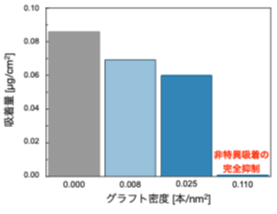 本研究では、直径が約200 nmの高分子ラテックス粒子の表面構造を細かく制御する手法を確立しました。このラテックス粒子は、ポリスチレンという樹脂を主成分としており、表面に「重合開始基(ATRP開始基)」と呼ばれる特別な重合の出発点を持たせることができます。研究チームはコア部となるラテックス粒子を合成する際に、ATRP開始基を有するモノマーとATRP開始基をもたないモノマーの仕込み組成を変えることにより、ATRP開始基の表面濃度(0.009 ~ 0.13 個/nm2)を制御することができました。 また、生体膜を構成するリン脂質に特徴的な双性イオン(両性イオン)注4)構造の「ホスホリルコリン基」を有するモノマーのATRPにより、鎖の長さが制御された高分子鎖を導入したコア-シェル型のラテックス粒子を合成しました(図2)。この結果、ATRP開始基から高効率でグラフト鎖が成長し、グラフト密度はσ = 0.008 ~ 0.11 本/nm2となりました。このコア-シェル型のラテックス粒子を、緩衝液中でタンパク質の一種であるウシ血清アルブミン(Bovine Serum Albumin:BSA)と混合し、BSAの吸着量を測定したところ、コア粒子(σ = 0.000 本/nm2)およびグラフト密度の低い(σ = 0.008、0.025 本/nm2)コア-シェル型のラテックス粒子ではある程度BSAが吸着してしまいましたが、グラフト密度の高い(σ = 0.11 本/nm2)コア-シェル型のラテックス粒子では、BSAの非特異吸着は完全に抑制されていることが明らかになりました(図3)。