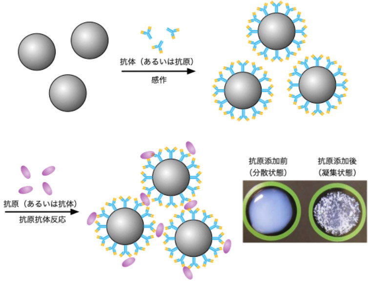 COVID-19、インフルエンザ、ノロウイルスなどのウイルス感染症への対応では、感染原因であるウイルスを特定し、急性期・回復期・既感染などの病状の各段階に応じた適切な治療方針を決定することが必要です。また、癌などの病気を早期に発見し、進行度や治療効果を正確に判定することは、生存率の向上につながります。現在までに、身体への負担が少なく、簡便性、迅速性、定量評価、コスト効率などに優れた様々なタイプのIVDが開発されています。IVDのなかでも、ラテックス粒子を利用した血液や尿などに含まれる特定のタンパク質を定量的に測定する「免疫比濁法」は、予防・診断・治療・予後管理の全ての段階を支える診断ツールとして広く利用されています。免疫比濁法では、ラテックス粒子表面に固定化した抗体(または抗原)と、血清などの検体中に含まれる抗原(または抗体)との抗原抗体反応を利用したラテックス粒子同士の特異的な凝集を「濁り度」として計測することにより、検査対象となる物質を定量的に評価することができます(図1)。