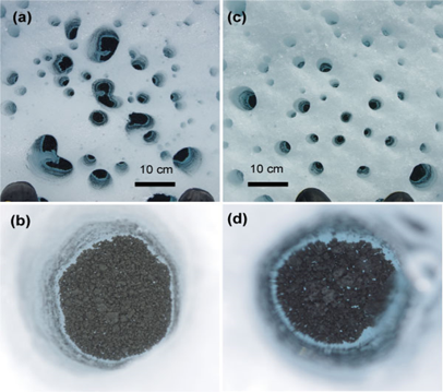 注2)クリオコナイト:鉱物粒子や有機物、微生物などからなる暗色の物質。ホールの底部だけでなく、氷河表面に広がると氷河の融解を促進する。