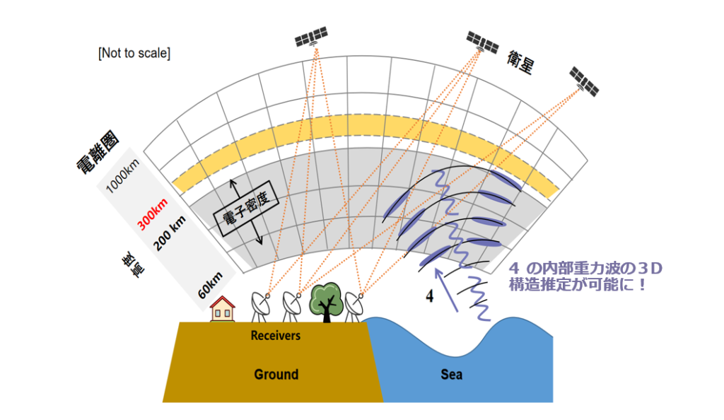 しかし、電離圏の3次元構造を解明すること(図2)は、地震‐大気‐電離圏結合過程の理解に不可欠であり、特に津波に伴って生成される「内部重力波(IGW)」を評価する上で極めて重要です。