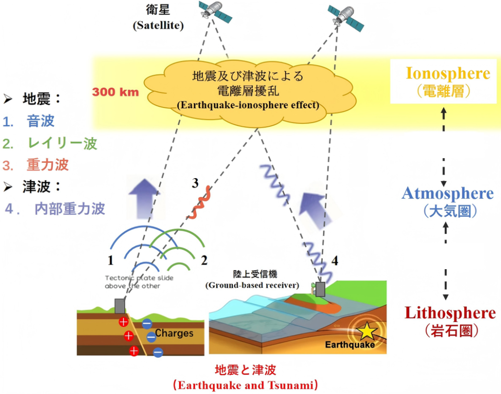 電離圏は地球大気中で高度約60 – 1000 kmの範囲に位置し、イオンと電子が存在する領域です。大規模な地震や津波が発生すると、急激な地殻変動やそれに伴う津波が大気を介して上空の電離圏に撹乱(Co-seismic Ionospheric Disturbances: CIDs)を引き起こします(図1)。これまで、電離圏撹乱の観測はGNSS受信機ネットワークにより観測されたTECデータを用いた’2次元的’な解析が主流であり、水平的な変化を捉えることはできても、CIDsの高度方向の進化を直接推定することは、困難でした。