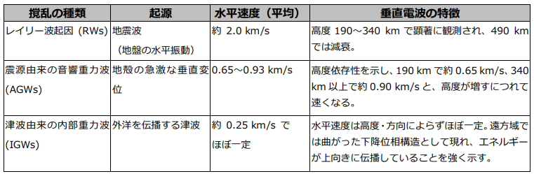 本研究により、地震に伴い発生する主要な3種の大気波動(①レイリー波起因のCIDs、 ② 震源由来の音響重力波、③津波由来の内部重力波)それぞれが、全く異なる垂直伝播特性を持つことを世界で初めて体系的に示しました。