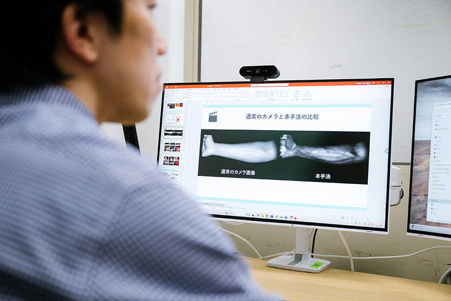 画像情報処理を専門としています。一般的にこの分野では、すでに撮影されたデータをAIやソフトウェアで「処理する方法」に着目した研究が主流ですが、私の研究室では「撮影方法そのもの」に焦点を当てています。具体的には、カメラや照明の使い方、レンズの設定などを工夫することで、人間の目や通常の撮影方法では捉えられない情報を画像として取り出すことを目指しています。こうして得られた画像データは、AIの性能向上にも大きく貢献する可能性があると考えています。