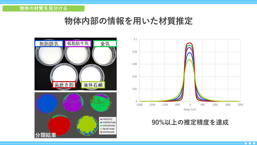 たとえば「コップに入った白い液体」の写真があるとしましょう。この写真をAIに入力すると、多くの場合は「牛乳」と認識されます。しかし、本当は「液体石鹸」かもしれません。一般的な写真は物体表面で反射した光を記録するため、物体表面の情報しか得られません。そのため、AIを使っても、白い液体の「材質」や「内部構造」の違いを見分けることは非常に難しいのです。