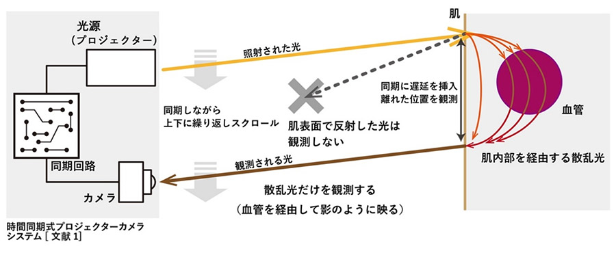 代表的なのは、皮下の血管を可視化する研究です。肌を普通に撮影するだけでは、肌表面からの反射光が強すぎて皮下の血管は当然写りません。そこで私たちは、プロジェクターとカメラを細かく制御して、光を当てる位置と撮影位置の間にわずかな「ギャップ」を設けることで、皮下の血管部分を通った光だけを選択的に捉えることに成功しました。