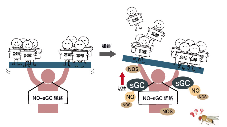 しくみを明らかにするために、ショウジョウバエの脳内で働く、遺伝情報を伝えたり働かせたりする重要な分子「リボ核酸 (RNA)」を解析し、加齢に伴う遺伝子の働き方の変化と、記憶に関わる遺伝子を比較し解析しました。すると、「NO–sGC経路」とよばれる神経内の反応が、加齢により過剰に活性化していることが示唆されました。