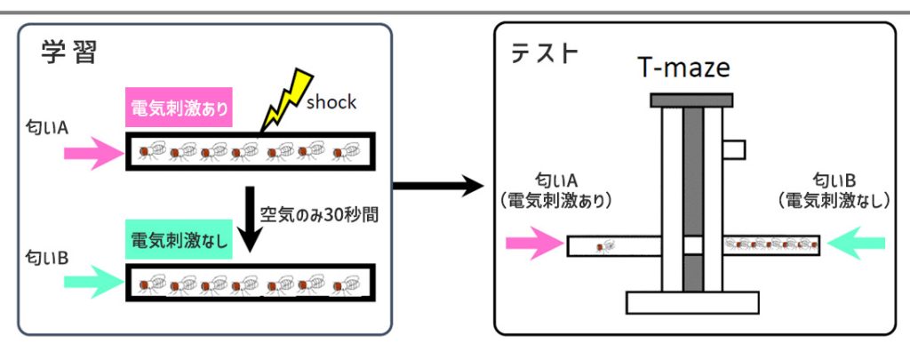 まず、ショウジョウバエに「匂いA」と弱い電気刺激を同時に与えて、匂いAを「嫌なことが起こる匂い」として学習させました。次に、電気刺激を伴わない「匂いB」も学習させた後、“T-maze”というT字型の迷路を使った実験で、約50匹の個体をまとめて試験し、嫌なことが起こる匂いAを避けて匂いBを選ぶハエの割合(回避率)を測定し、記憶の定着度を評価しました。